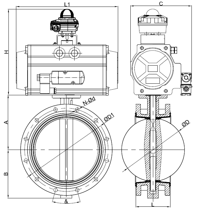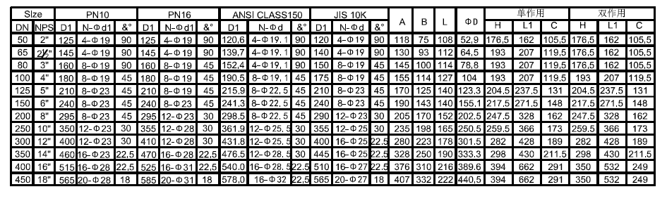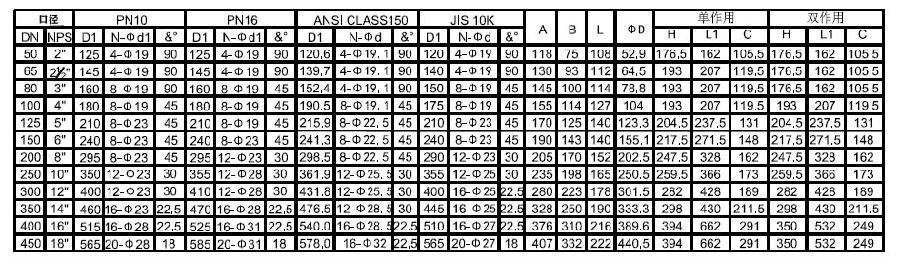 蝶阀小巧轻便,拆卸维修方便,可安装在任何位置。 结构简单紧凑,操作扭矩小,90度旋转开启快;密封结构采用聚四氟乙烯、合成橡胶和酚醛树脂组成复合阀座,使阀座具有弹性和较好的强度。同时,蝶板充分包覆聚四氟乙烯,使蝶板具有很强的耐腐蚀性。 流动特性往往是直的和可调节的。 气动法兰蝶阀尺寸表: