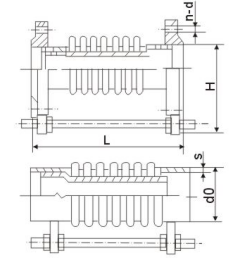 公称 通径 DN mm | 计算疲劳破坏次 数下轴向补偿量 Xomm | 补偿量 | 刚度 | 有效 面积 A cm2 | 径向 最大 外形 尺寸 Hmm | 接管端口 尺寸 doxS(mm) | 总长L (mm) | 总重W (kg) | ||||||||