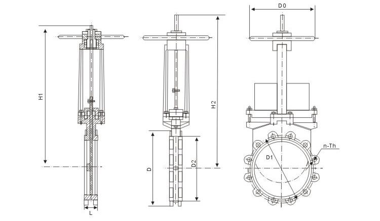 PN(MPa) | DN(mm) | L | D | D1 | D2 | D0 | n-Th | d | H1 | H2 | 重量(kg) |
